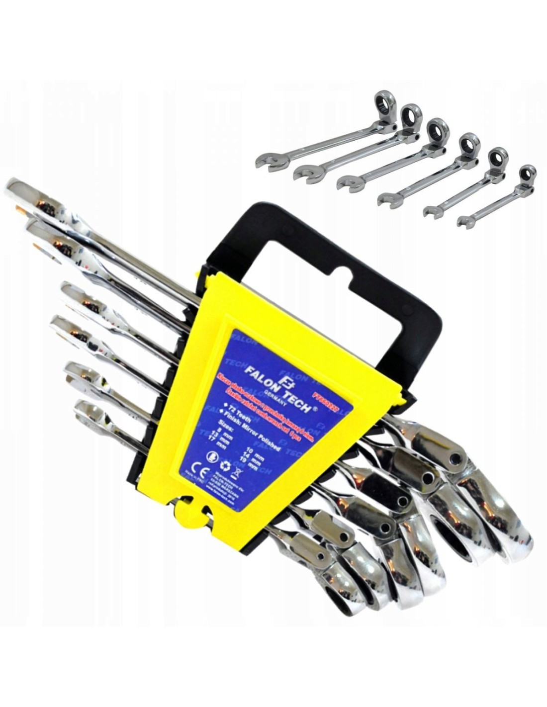 Zestaw kluczy łamanych płasko-oczkowych z grzechotką (mechanizm 72 zęby) 8-19mm wykonanych z wytrzymałej stali chromowo-wanadowej (CrV).