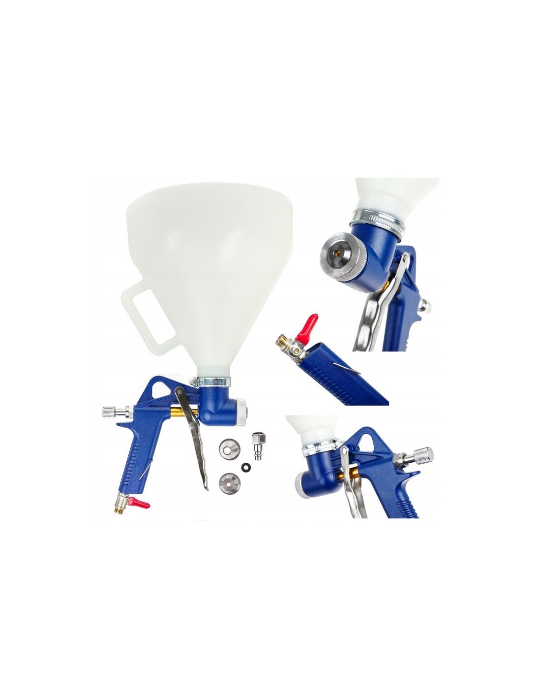 Uniwersalny pistolet pneumatyczny do malowania, tynkowania, gipsowania. Pistolet przeznaczony jest do malowania farbą emulsyjną, farbami klejowymi, do bielenia wapnem jak również do nanoszenia tynków akrylowych na docieplenia. Idealnie nadaje się do nanoszenia tynków, gładzi gipsowych, można nim robić fakturę czyli tzw. "baranka" na ścianie. Pojemnik pistoletu zakryty jest do połowy, co umożliwia malowanie sufitów bez stosowania żadnych dodatkowych kolanek, pokryw itp. rozwiązań. Pistolet wykonany jest całkowicie z aluminium, więc jest lekki i wygodny w eksploatacji oraz łatwy w czyszczeniu i wytrzymały. Ciśnienie potrzebne do pracy pistoletu powinno wynosić około 2 - 4 atmosfer.